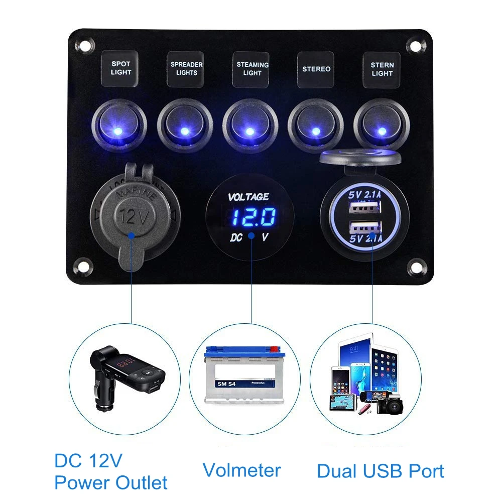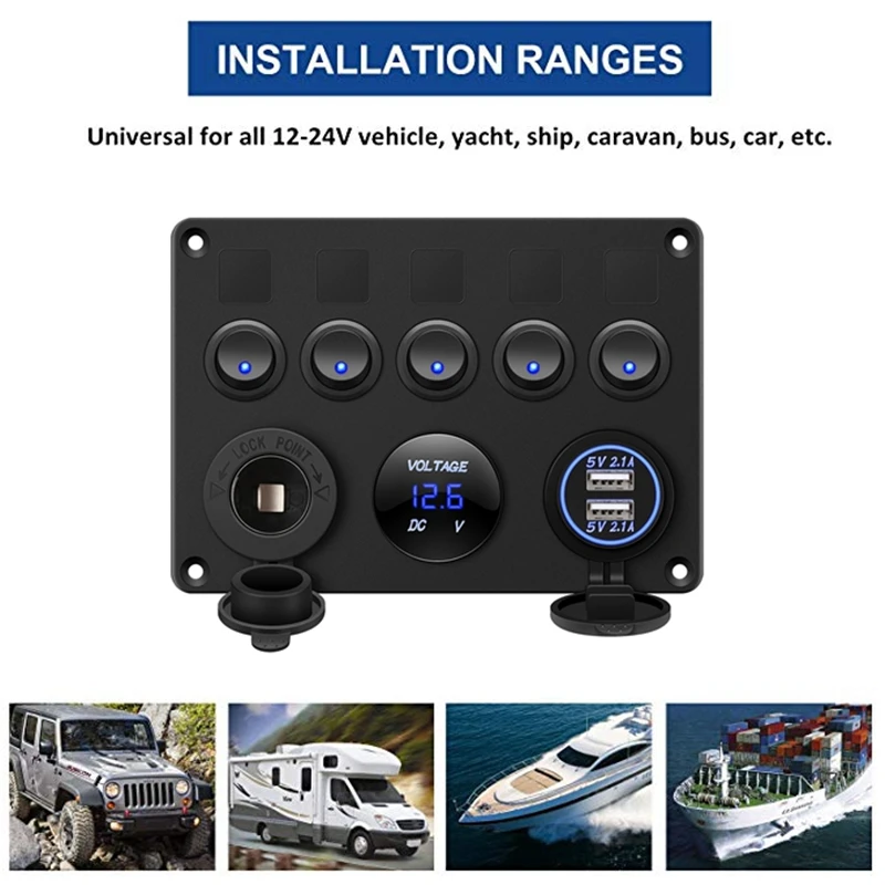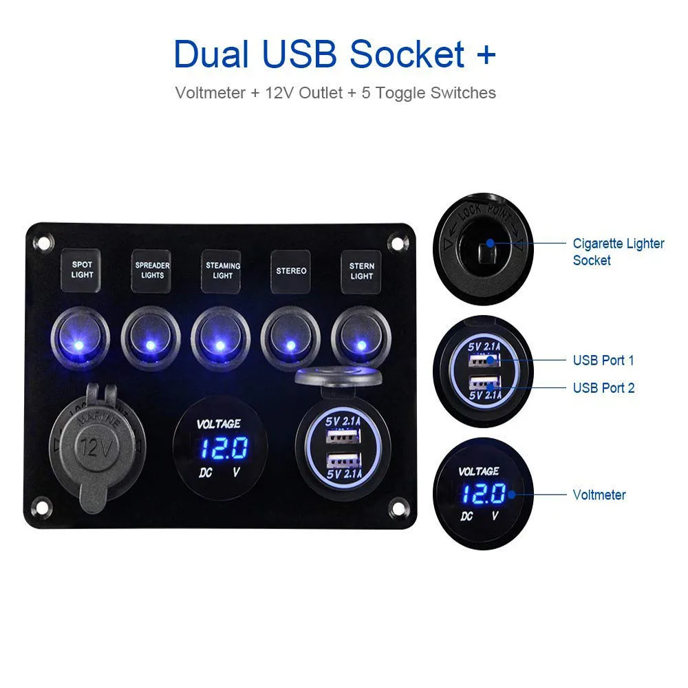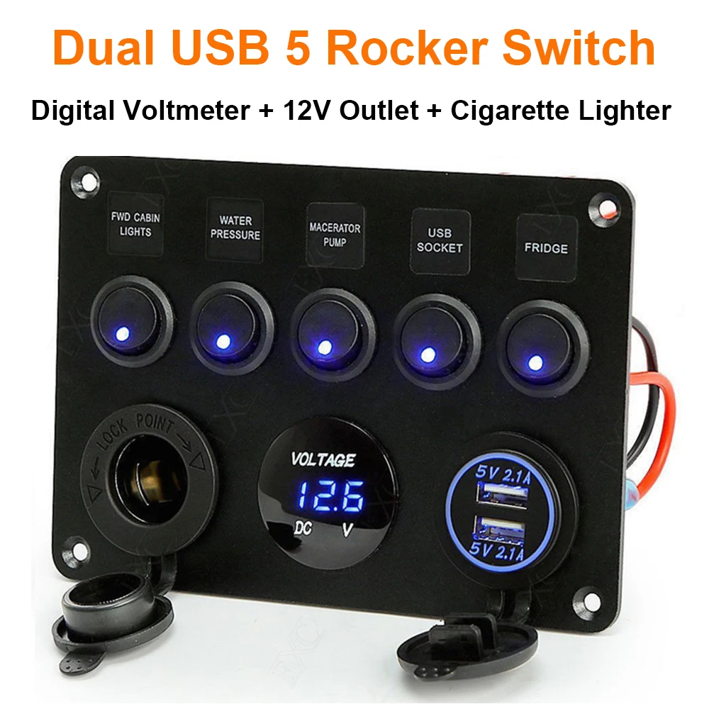 Product Name: 5 przełącznik schodowy Panel 12 V 24 V woltomierz cyfrowy przełącznik Rocker niebieskie jasne światło led z zapalniczką podwójny USB dla ciężarówki łodzi RV