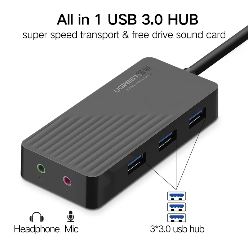 Product Name: Ugreen wszystko w jednym karta dźwiękowa USB z 3 Port USB 3.0 Splitter zewnętrzna 3.5mm Adapter USB interfejs audio dla dźwięk komputerowy karty