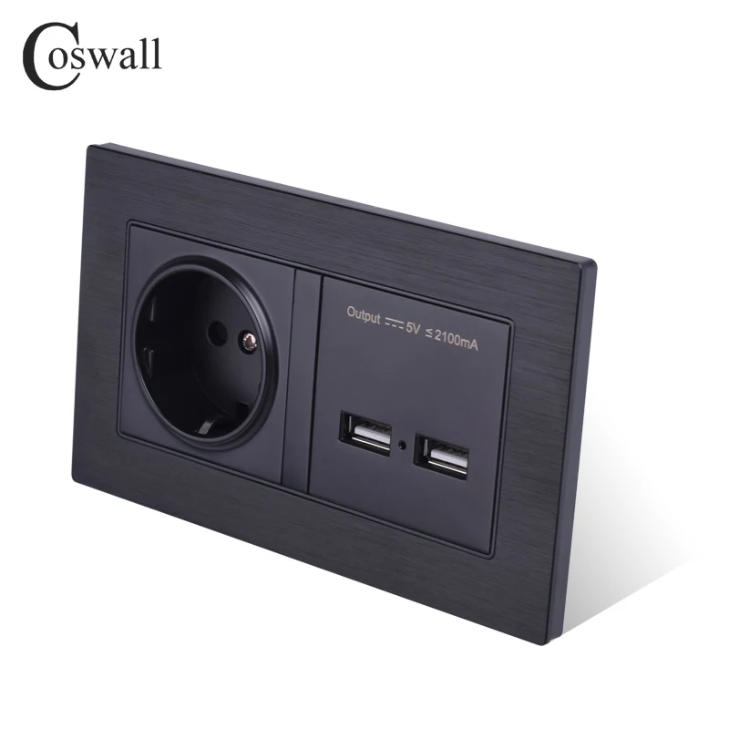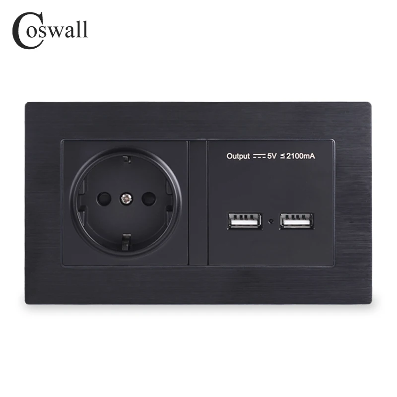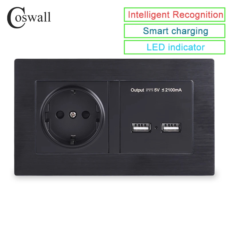 Product Name: COSWALL aluminium metalowy panel gniazdo ścienne standard ue listwa sieciowa z podwójnym USB inteligentny indukcyjny port ładowania dla telefonów komórkowych 5V 2.1A