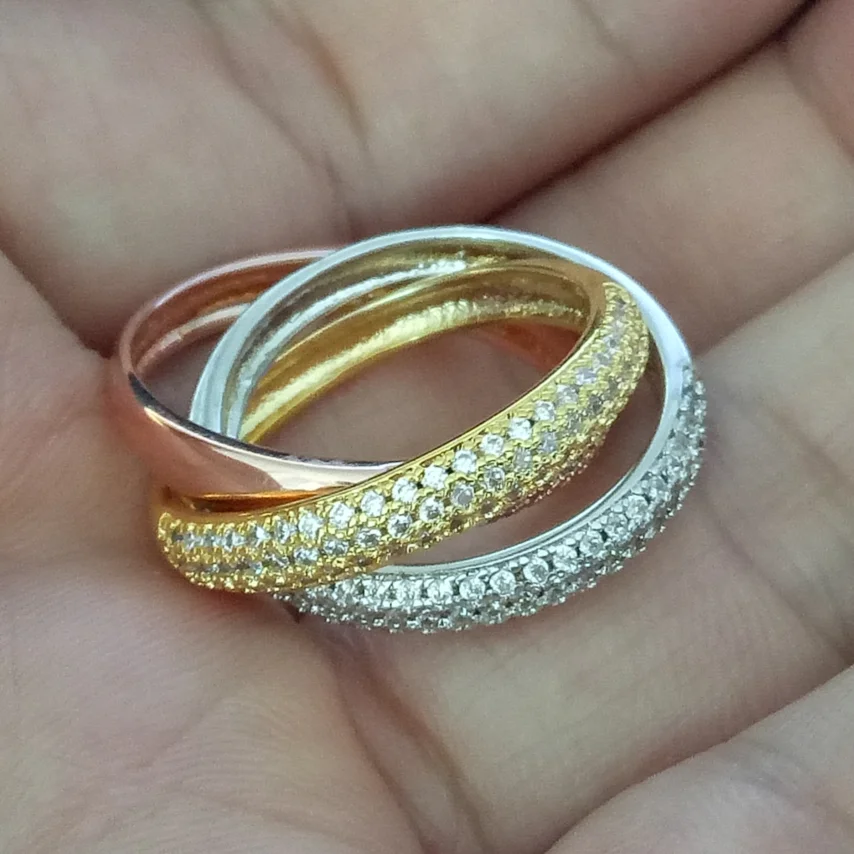 Special Offer Potrójne koła złoto różowe złoto srebrny pierścień trzy kolory luksusowa biżuteria ze srebra próby 925 Pave pierścień cz kobiety obrączki ślubne prezent Discount 91% Today!