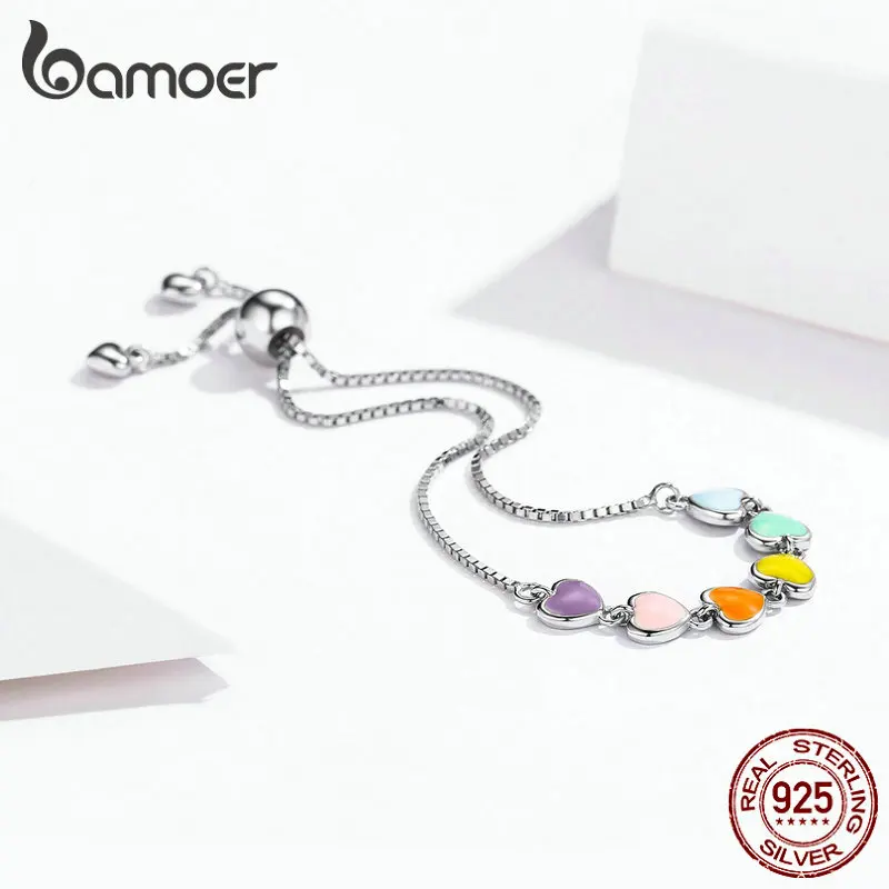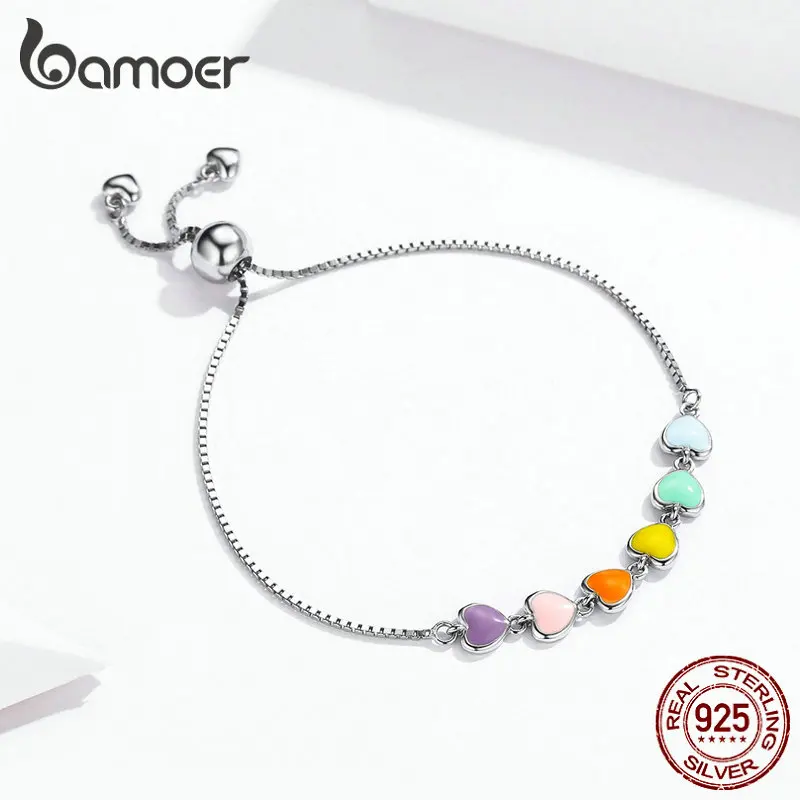 Product Name: Bamoer kolor tęczy emalia bransoletka z serduszkiem dla kobiet w kształcie serca 925 Sterling Silver Chain bransoletka antyalergiczna biżuteria SCB158