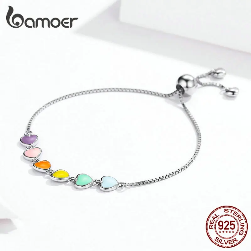 Special Offer Bamoer kolor tęczy emalia bransoletka z serduszkiem dla kobiet w kształcie serca 925 Sterling Silver Chain bransoletka antyalergiczna biżuteria SCB158 Discount 30% Today!