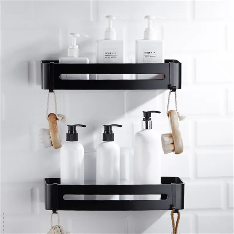 Special Offer LIUYUE półki łazienkowe czarne aluminium łazienka kwadratowe uchwyty na haki półka ścienna szampon półki kosmetyczne regał magazynowy Discount 40% Today!